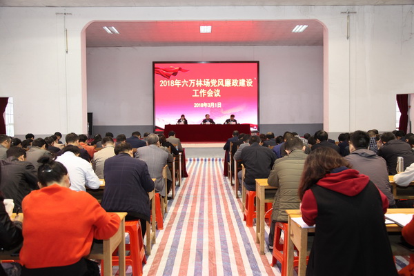 3月1日上午,六万林场场在场部大礼堂召开2018年党风廉政建设工作会议,场领导、正副调研员、全场副科级以上领导干部、机关全体工作人员160多人参加会议。会议由党委副书记、场长樊吉尤主持。
